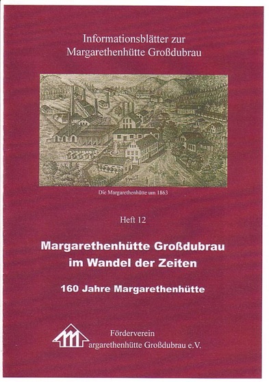 Heft 12 – „Margarethenhütte Großdubrau im Wandel der Zeiten“A5-Broschüre, 40 Seiten, Preis 5 Euro (zuzüglich Versandkosten) Als im Jahre 1839 Anton Hallbauer, Bergauditor aus Freiberg in Teilen der Oberlausitz nach Bodenschätzen suchte, fand er auch Braunkohlen im Raum Großdubrau–Quatitz–Merka. 1854 wurde von einem Dresdener Konsortium der „Thonwaaren- und Braunkohlen- Actien-Verein Großdubrau“ gegründet. 1857 stellte Fedor Geyer den Antrag zur Verleihung des Namens Margarethenhütte, der im September gleichen Jahres urkundlich bestätigt wurde. Aus diesem Anlass wurde die Broschüre herausgegeben. Sie behandelt die Braunkohle und die Grobkeramik, die Namensgebung der Margarethenhütte, die Porzellanfertigung.