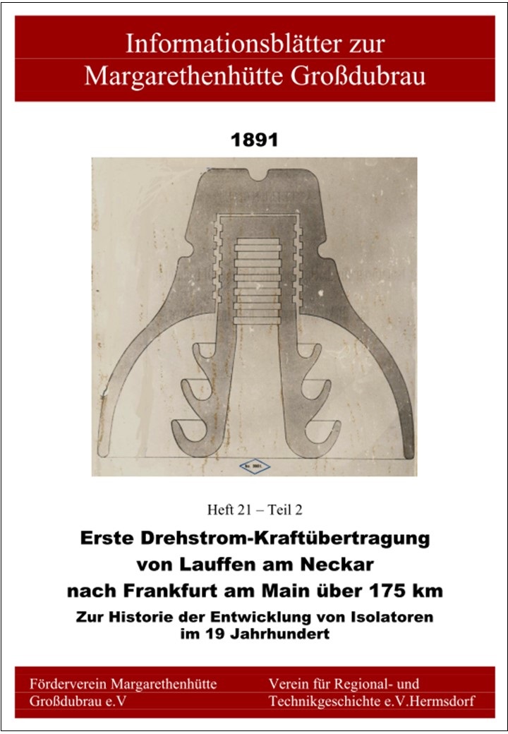 Heft 21, Teil 2 - erste Drehstrom-Kraftübertragung – Historie der Entwicklung von Isolatoren im 19. Jahrhundert A5 Broschüre, 35 Seiten, Preis 5 Euro (zuzüglich Versandkosten) Der Siegeszug der Drehstromübertragung begann 1891. Im ersten Kapitel der Broschüre wird die Entwicklung der Hochspannungs-Isolatoren bis hin zu den Öl-Isolatoren der Lauffener Anlage in technisch-historischer Chronologie dargestellt. Dazu gibt es viele Abbildungen vom Telegraphie-Isolator von 1849 bis hin zu den Öl-Isolatoren, welche 1891 bei der ersten Drehstrom-Kraftübertragung verwendet wurden. Das zweite Kapitel beschäftigt sich mit folgenden Fragen: